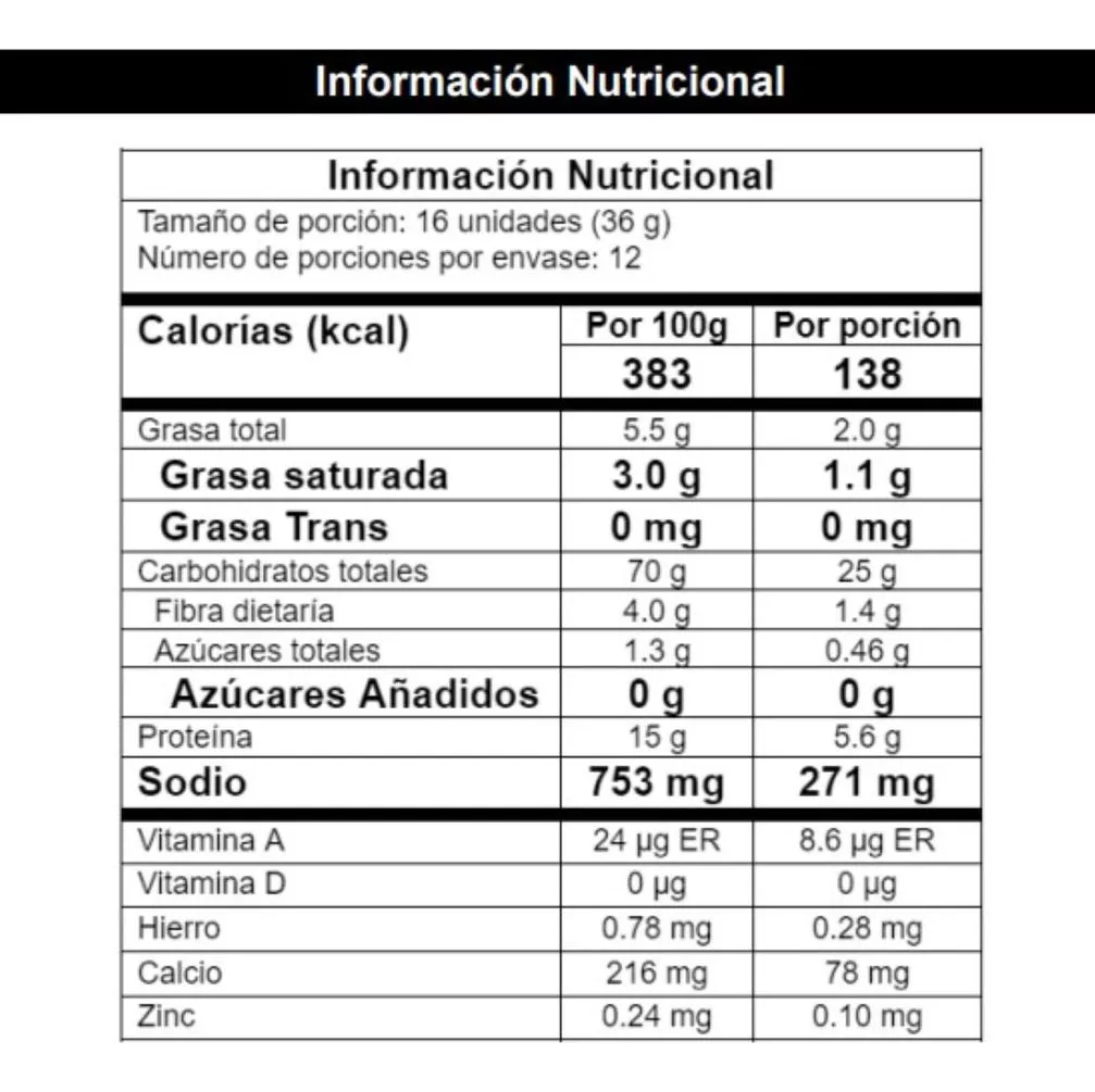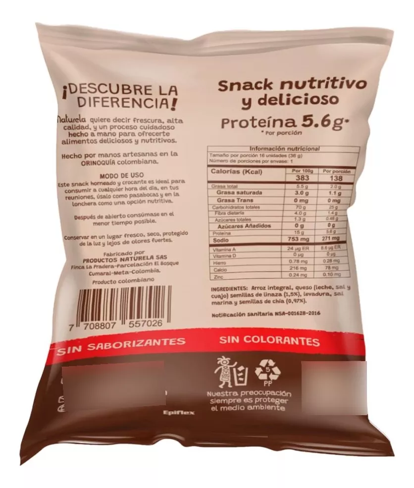 Arroz integral, queso (leche, cuajo y sal), semillas de linaza, levadura, sal marina y semillas de chía.
