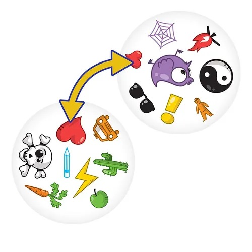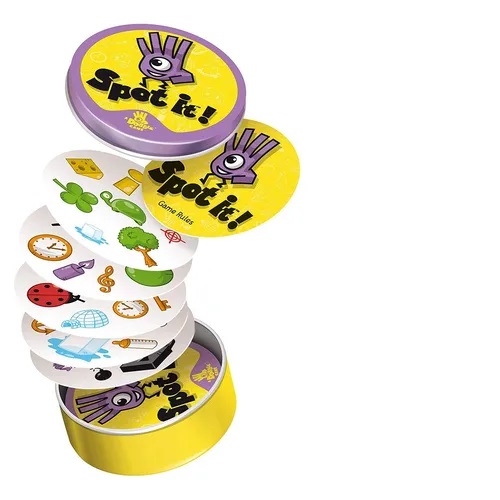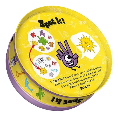 Este Spot it! El juego de cartas es un juego de velocidad, observación y reflejos, amado en todo el mundo, este galardonado juego de cartas se ha convertido rápidamente en uno de los favoritos de la familia. Cada carta tiene una serie de imágenes y es tu trabajo detectar la imagen en dos de las cartas que forman un par. Hay 55 cartas, con 50 símbolos diferentes y 8 símbolos por carta. Solo se comparte un símbolo entre dos cartas, y sí, siempre hay una coincidencia, ¡así que presta atención o tu oponente te ganará!