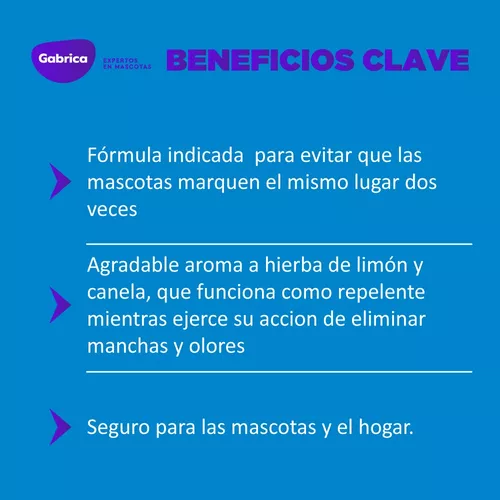 Beneficios * Fórmula entrenadora * Para evitar que las mascotas marquen el mismo lugar dos veces. * Con removedor de manchas y olores. * Seguro para las mascotas y el hogar.