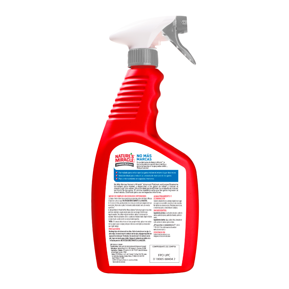 El removedor de manchas y olores Nature’s Miracle remueve orina, heces, vómitos, saliva y otras manchas y olores orgánicos de los gatos. Las fórmulas a base de bacterias producen enzimas cuando entran en contacto con una fuente de alimento: orina de mascotas, heces, vómitos y otros desechos de origen biológico. El limpiador enzimático continuará funcionando mientras la fuente de alimento esté presente. ¡Este producto también refresca con un ligero aroma cítrico! El removedor de manchas y olores Nature’s Miracle también es seguro para las mascotas y el hogar cuando se usa y almacena según las indicaciones. Confíe en el Milagro cuando encuentre soluciones para un hogar limpio y una mascota feliz y saludable.