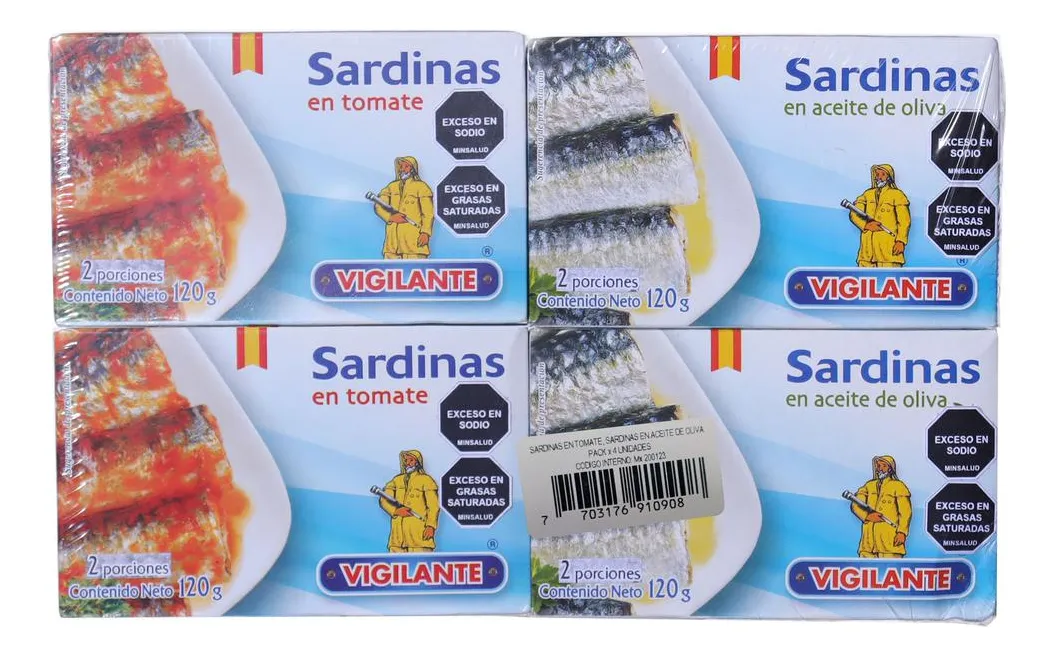 Descripción La sardina utilizada en nuestras conservas siempre es la especie Sardina pilchardus. Este pez que pertenece a la familia de los cupleidos. El tono azulado de sus dorsales y su vientre plateado la hacen fácilmente distinguible. Se trata de una especie muy común en las costas españolas, llegando a medir 25 cm. Ingredientes Sardinas En Tomate: Sardinas, Tomate, Aceite Vegetal, Aroma Natural De Chili Y Sal. Sardinas En Aceite De Oliva : Sardinas, Aceite De Oliva Y Sal. Información del producto Sardinas en tomate 2 Unidades. Sardinas aceite oliva 2 Unidades. Pescado azul por antonomasia, por tanto más graso, energético y con más vitaminas liposolubles que el blanco. Etiquetas Libre de lactosa Especificaciones Almacenamiento Temperatura ambiente Peso de la unidad (cada uno) 120.0000 g Peso neto 480.0000 g Cantidad de paquetes (recuentos) 4 País de origen España Importado o Nacional Importado Tipo de alimentos enlatados o envasados Conservas de atún y mariscos AlérgenosPescado (por ejemplo: lubina, platija, bacalao) Moluscos (por ejemplo: mejillones, caracoles terrestres, calamares, buccinos) Marca Vigilante